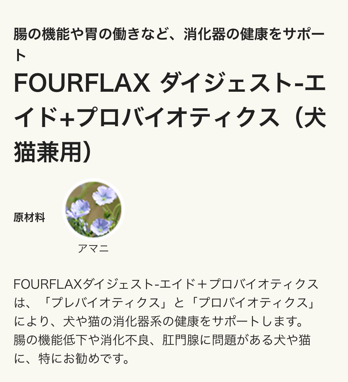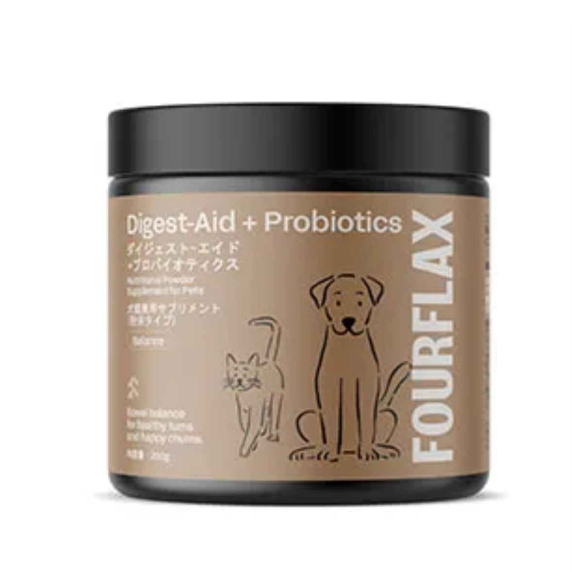 FOURFLAXダイジェスト-エイド+プロバイオティクスは、「プレバイオティクス」と「プロバイオティクス」により、犬や猫の消化器系の健康をサポートします。