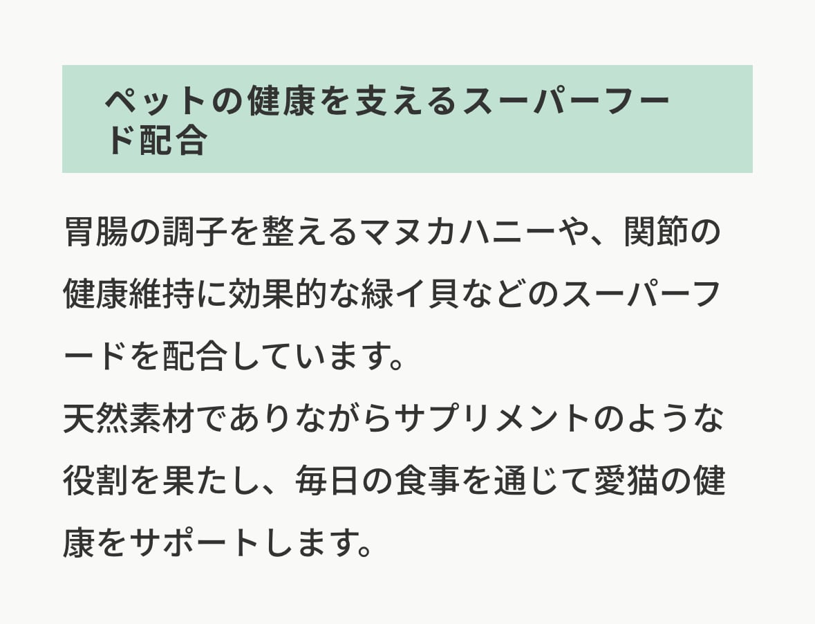 天然素材でありながらサプリメントのような役割を果たし、毎日の食事を通じて愛猫の健康をサポートします。