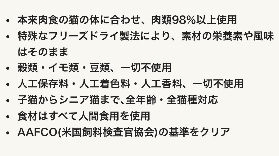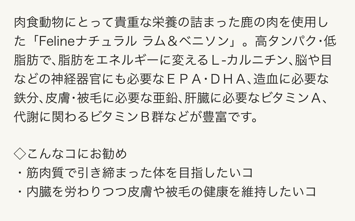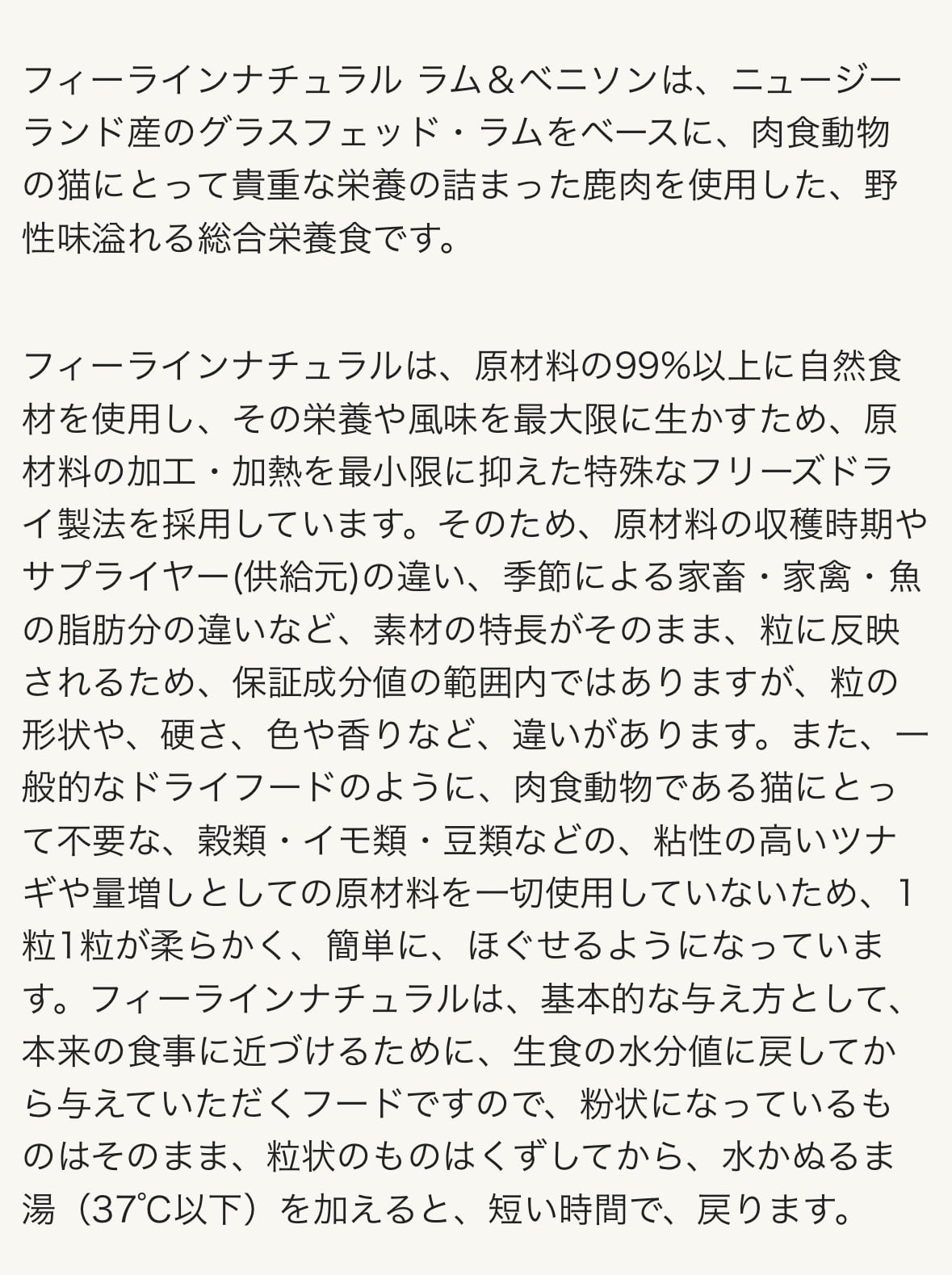 肉食性の強い猫用のフィーラインナチュラルの原材料は、肉類98%以上で総合栄養食の基準を満たしています。