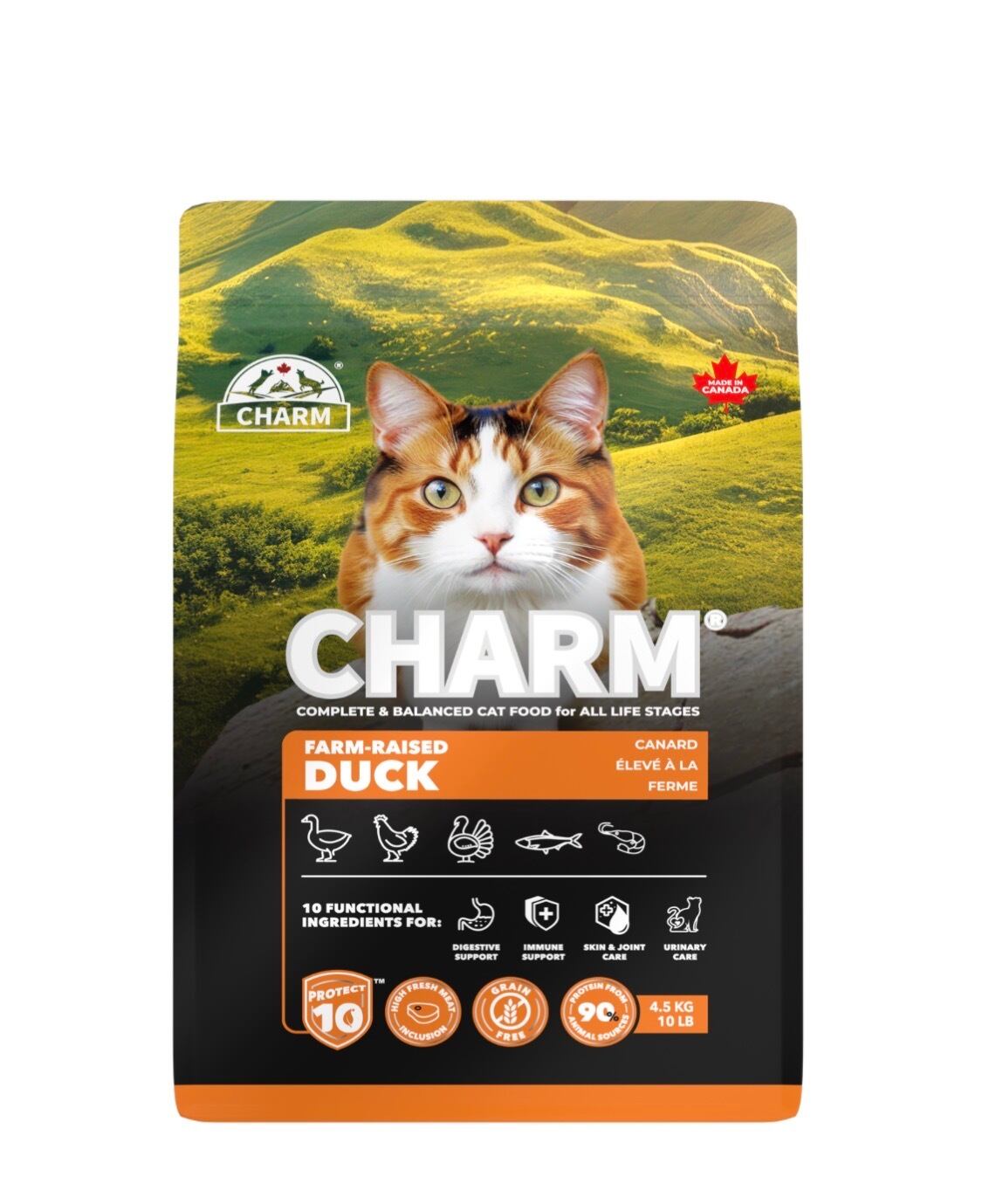 CHARM(チャーム)ファームレイズドダック キャットフードは、鴨肉と七面鳥、全卵、魚介類を豊富に使った高たんぱく・グレインフリードライフードです。