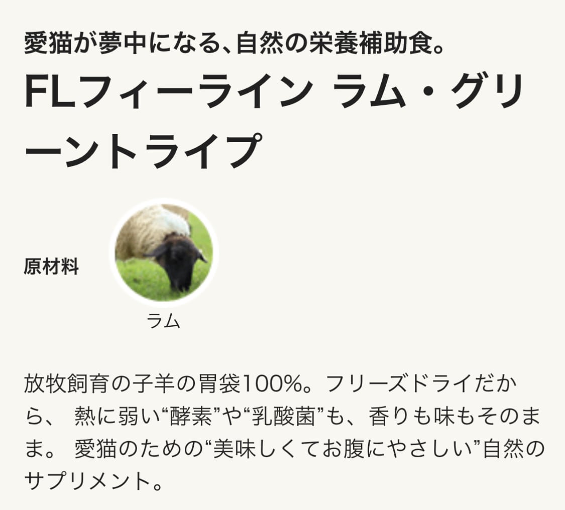 放牧飼育の子羊の胃袋100%。フリーズドライだから、 熱に弱い“酵素”や“乳酸菌”も、香りも味もそのまま。 愛猫のための“美味しくてお腹にやさしい”自然のサプリメント。