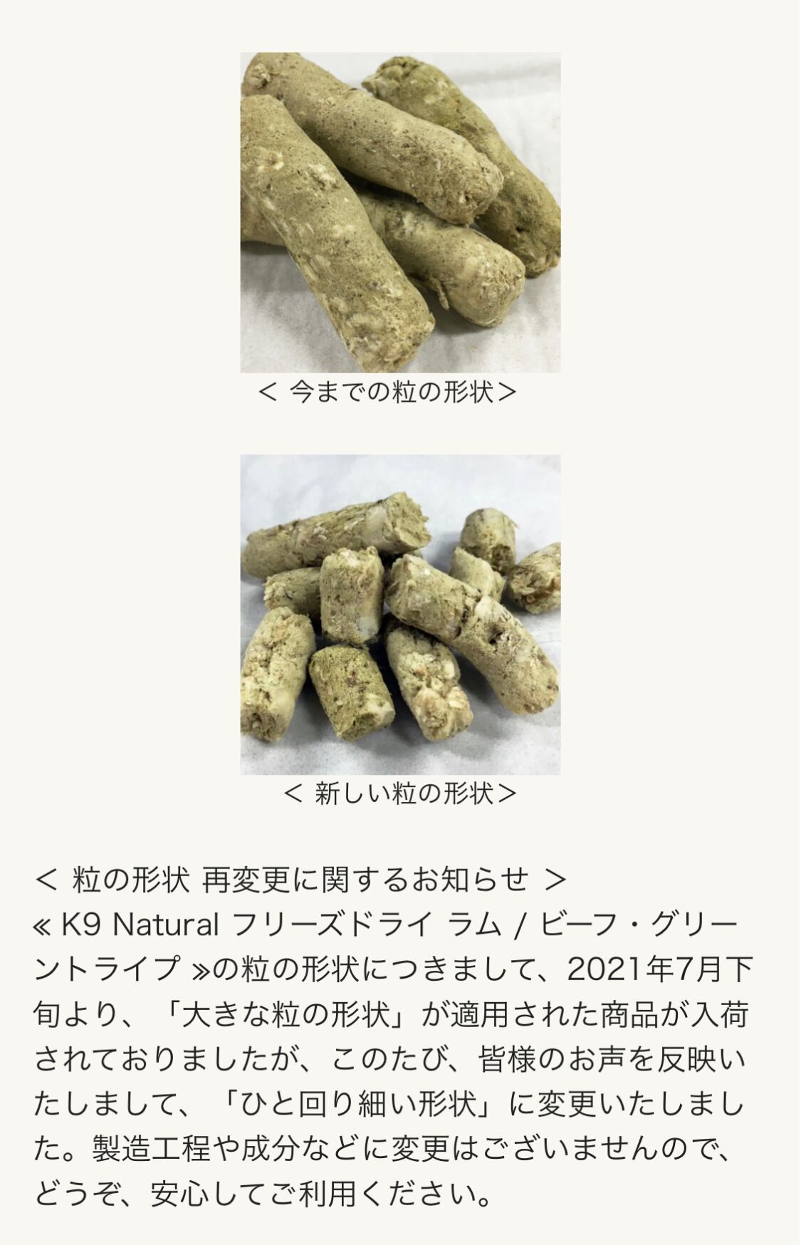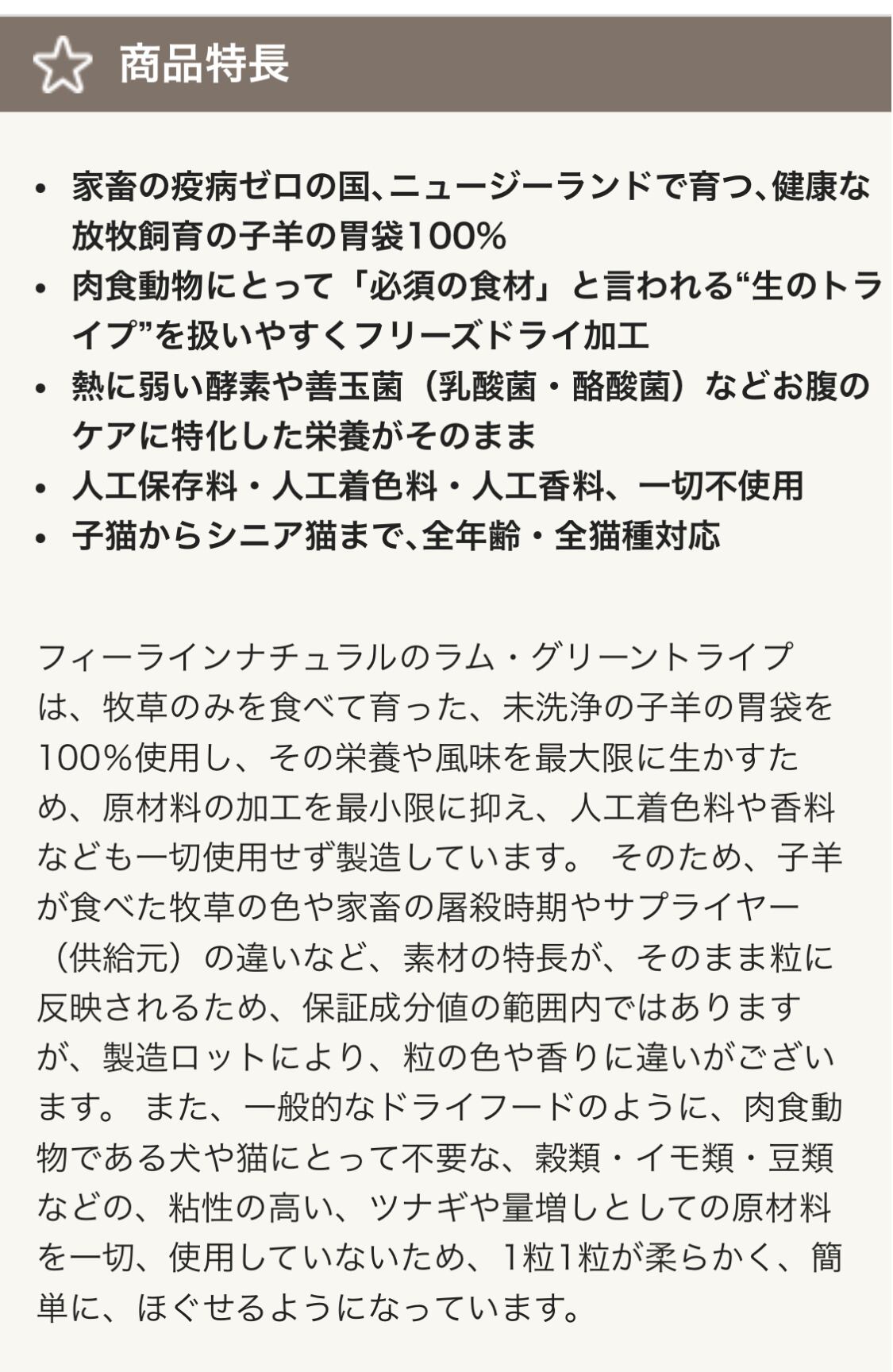 ●非加熱でフリーズドライされた「生のグリーントライプ」には、消化中の草の食物繊維に含まれる「プレバイオティクス」(善玉菌のエサ)と、熱に弱い酵素や乳酸菌