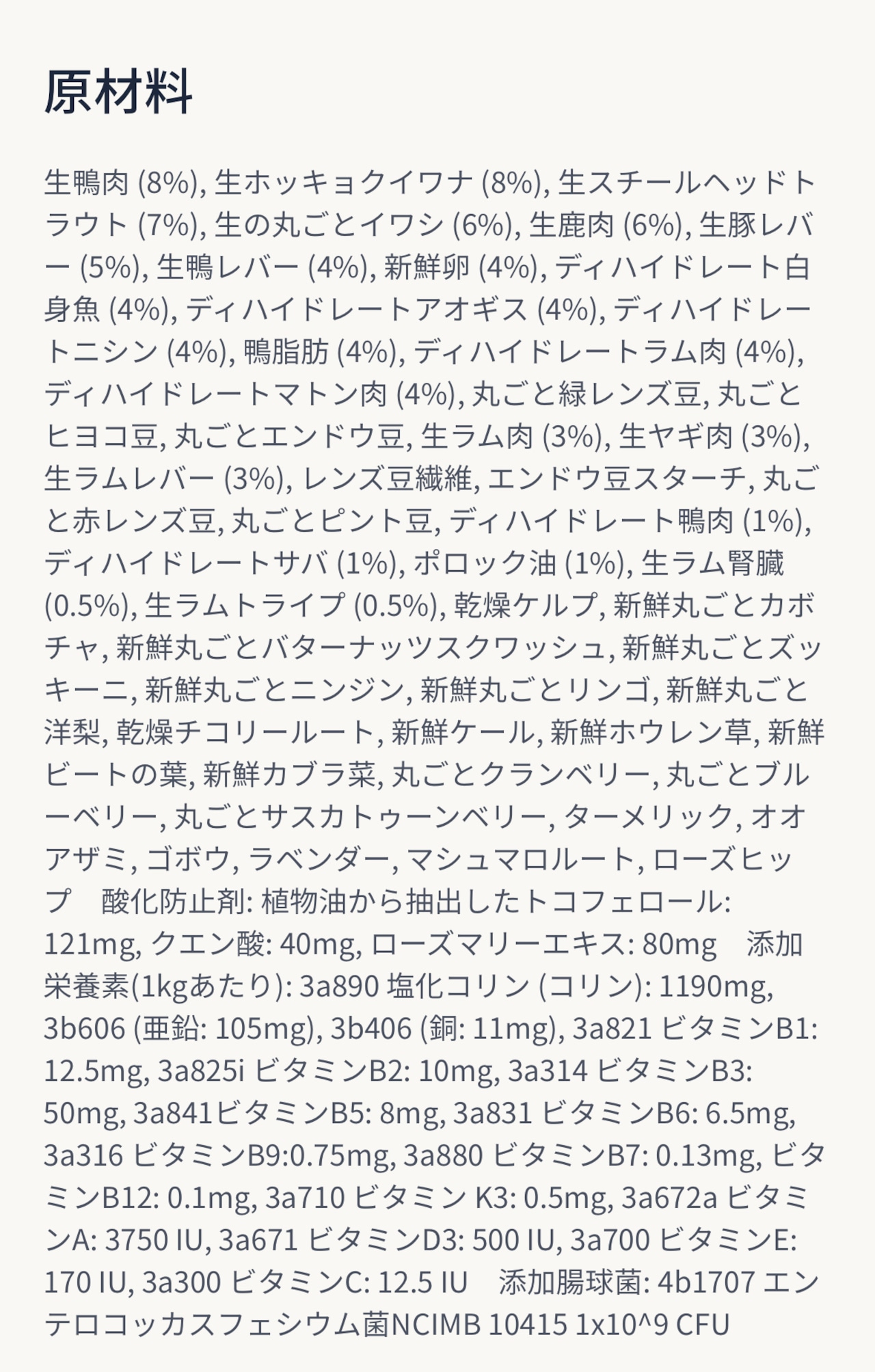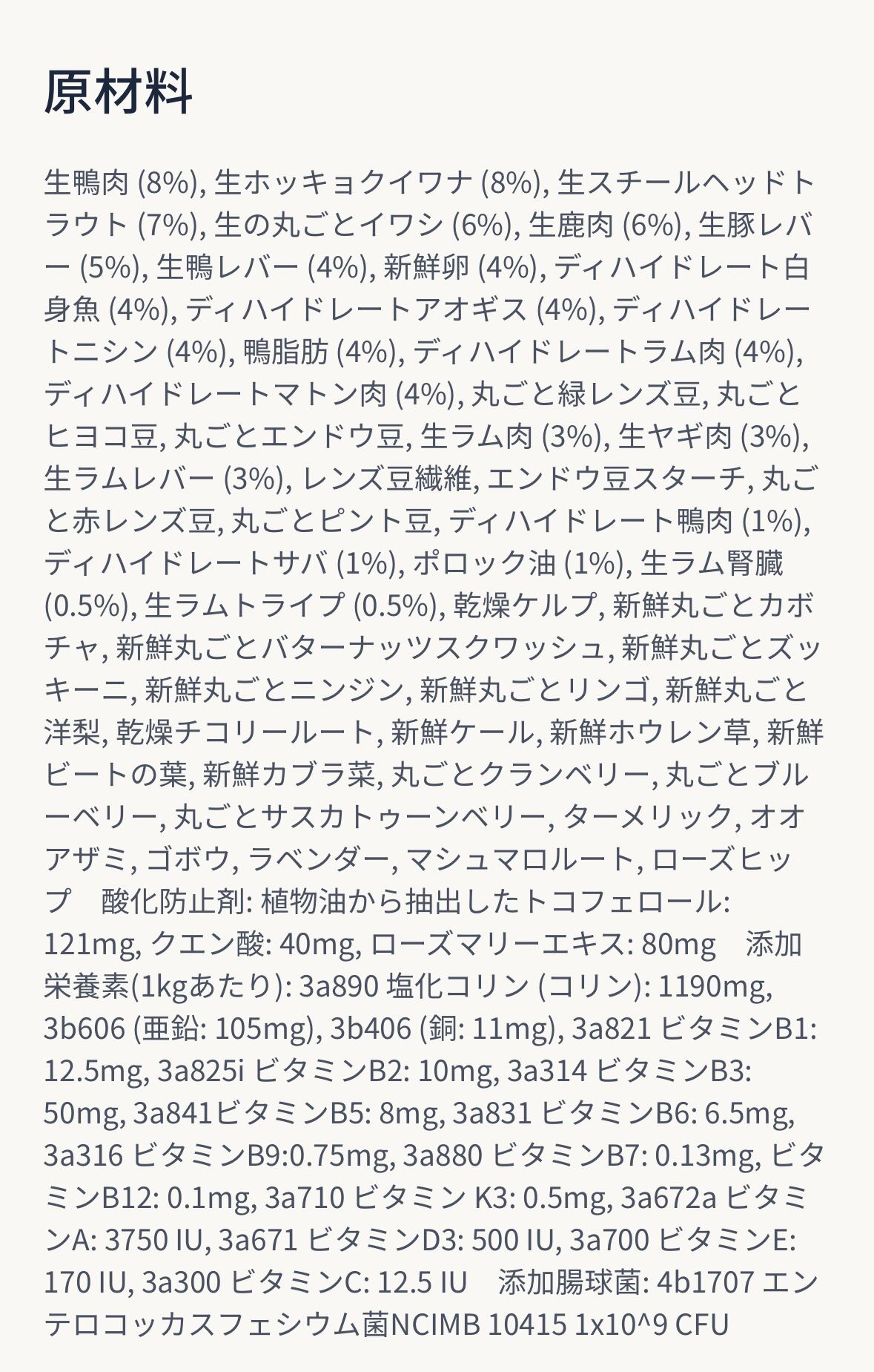 肉、内臓、軟骨、骨を丸ごと使用することで自然本来の栄養素を再現しています。