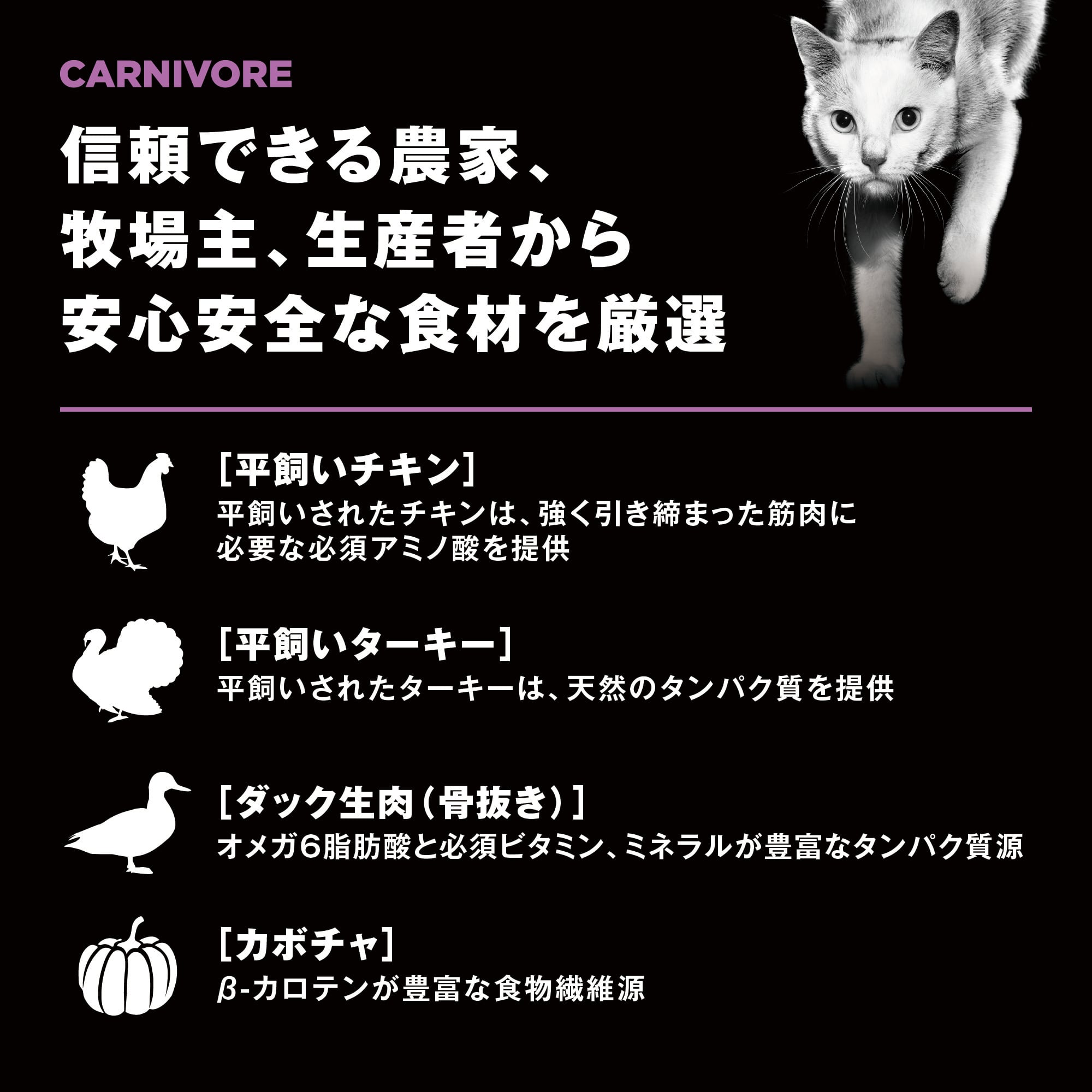 「カーニボア=肉食」のシリーズ名が表すとおり、贅沢に動物性原材料を配合したとびきり美味しいグレインフリーのプレミアムキャットフードです。