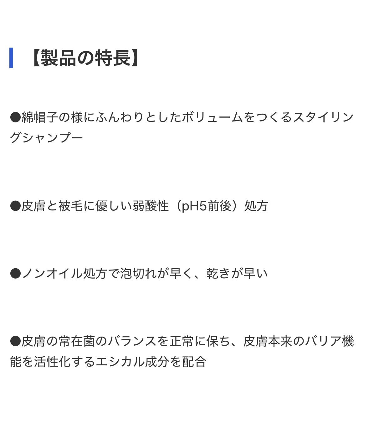 被毛のふんわり感・保湿感・洗い上がりの軽さを追求し、泡立ちのキメ細かさや泡持ちを向上。洗浄時の摩擦を軽減し、ふんわり仕上げに必要な根元からの立ち上がり感を損なわない処方です。