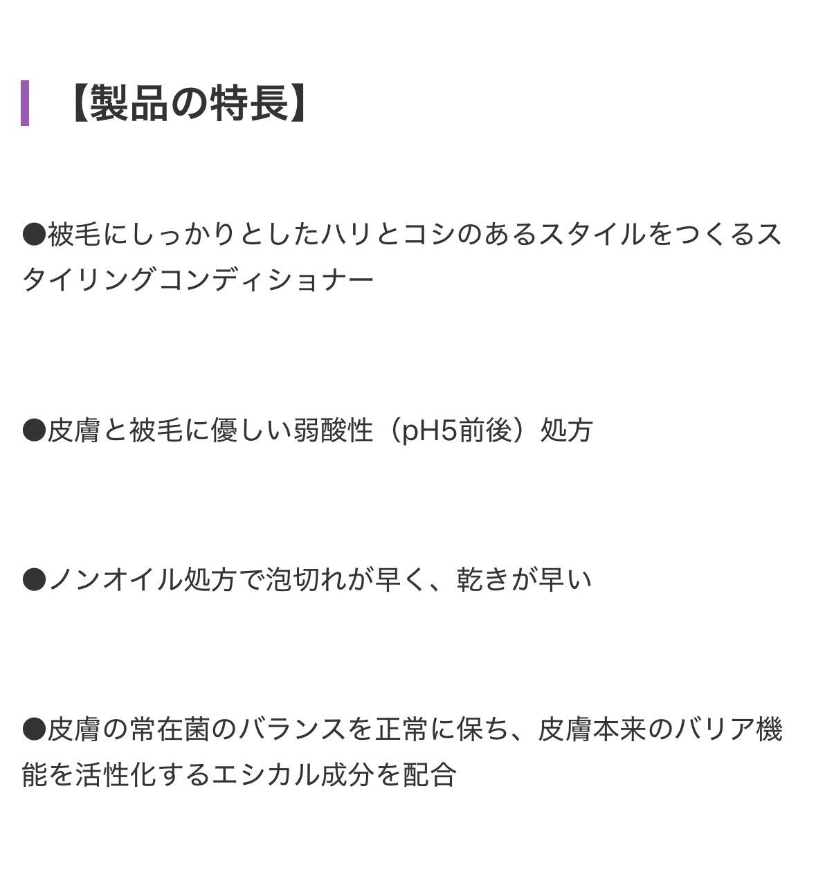 2種類の加水分解コラーゲンでハリとコシのあるスタイルを創りだすスタイリングコンディショナー。リニューアルでツヤ・ハリコシ向上効果をより強化。植物エキスによる皮膚ケアと被毛の補修を両立。