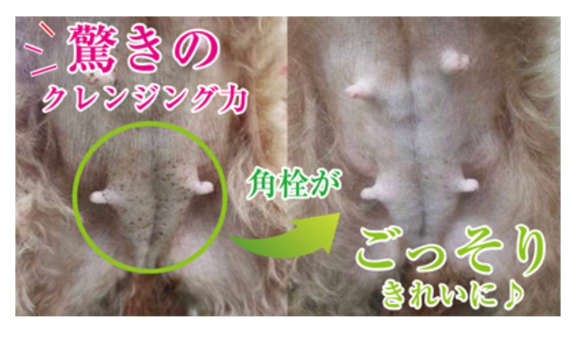 皮膚や被毛を全く傷めることなく、皮膚や被毛にこびりついた頑固な皮脂汚れやスタッドテールを優しく取り除くことが出来ます。