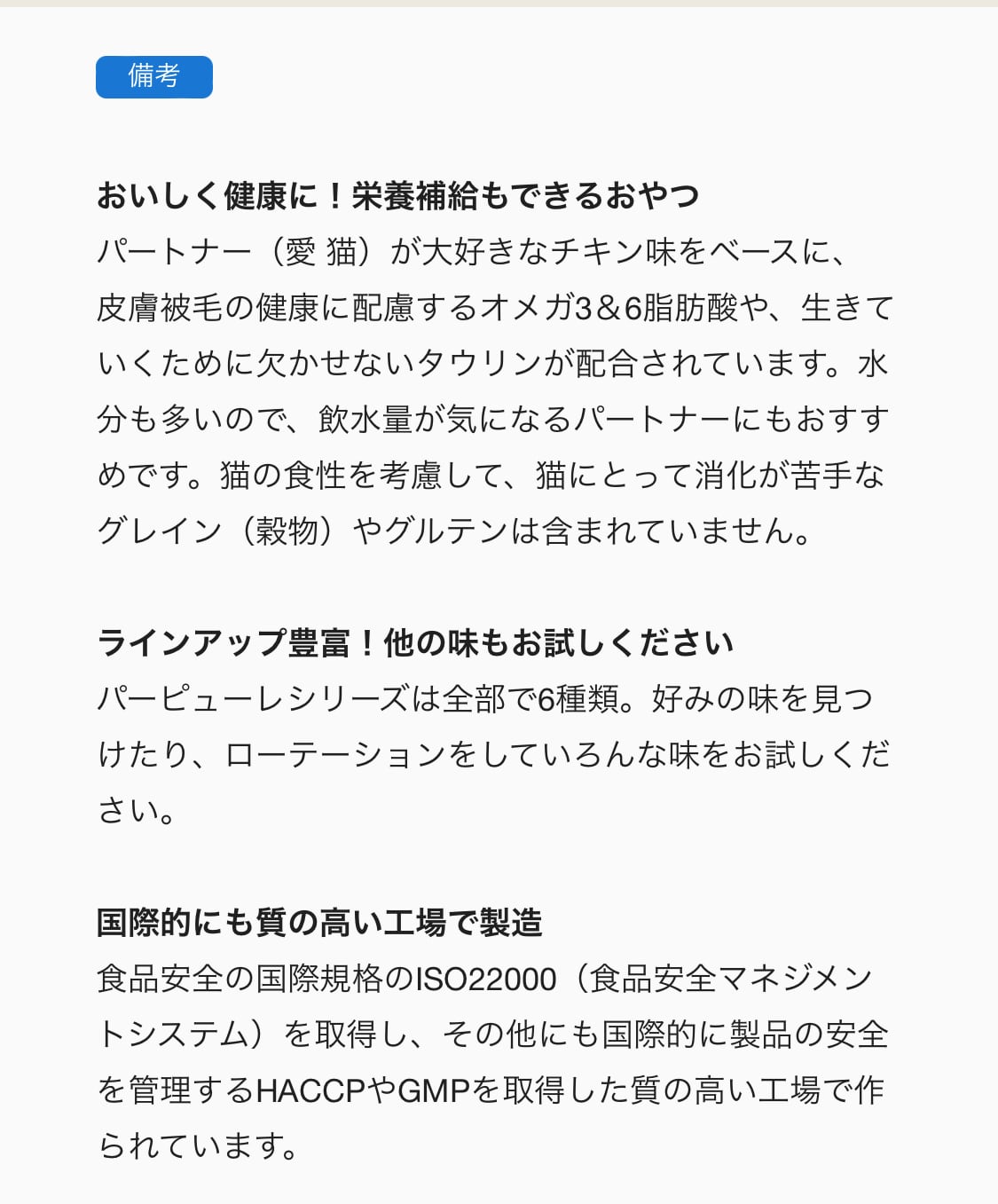 うれしい小分け包装なのでいつでもサッと与えられ、トッピングとしてもおすすめです。人工着色料、人工香料、化学保存料不使用です。