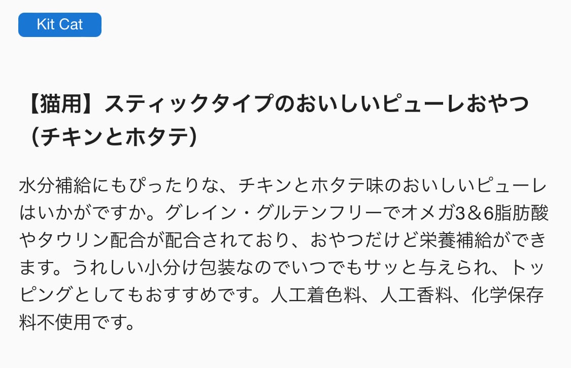 グレイン・グルテンフリーでオメガ3&6脂肪酸やタウリン配合が配合されており、おやつだけど栄養補給ができます。