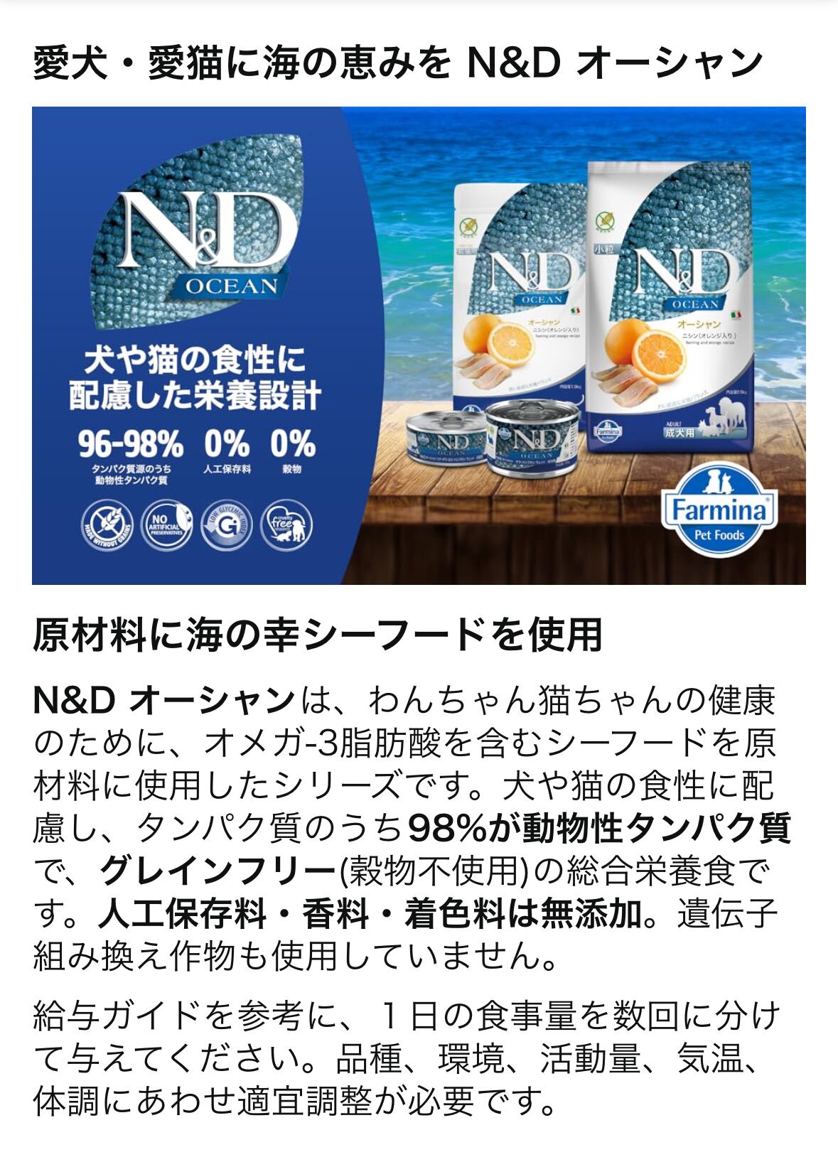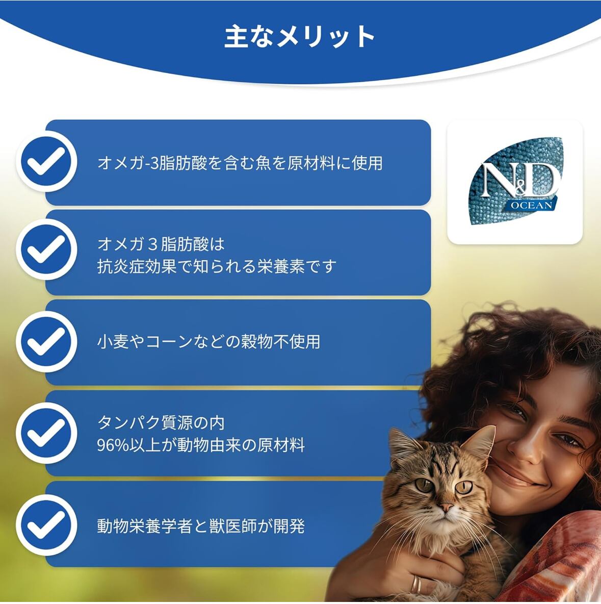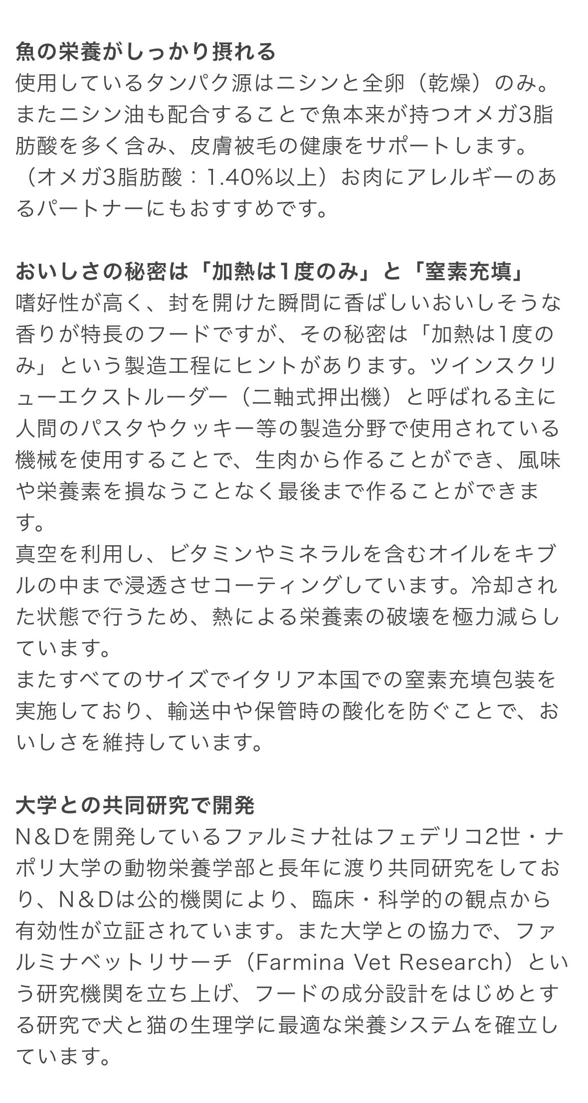 ニシンを主原料に、サツマイモや魚油、果物、野菜をふんだんに使った魚メインの成猫用フードです。ニシンとニシン油を使用することで皮膚被毛の健康をサポートするオメガ3脂肪酸も多く含んでいます。封を開けた瞬間から広がる魚の良い香りがパートナー(愛猫)の食欲をそそること間違いなし!お魚が好きなパートナーや運動量の多いパートナー、お肉類にアレルギーのあるパートナーにおすすめです。