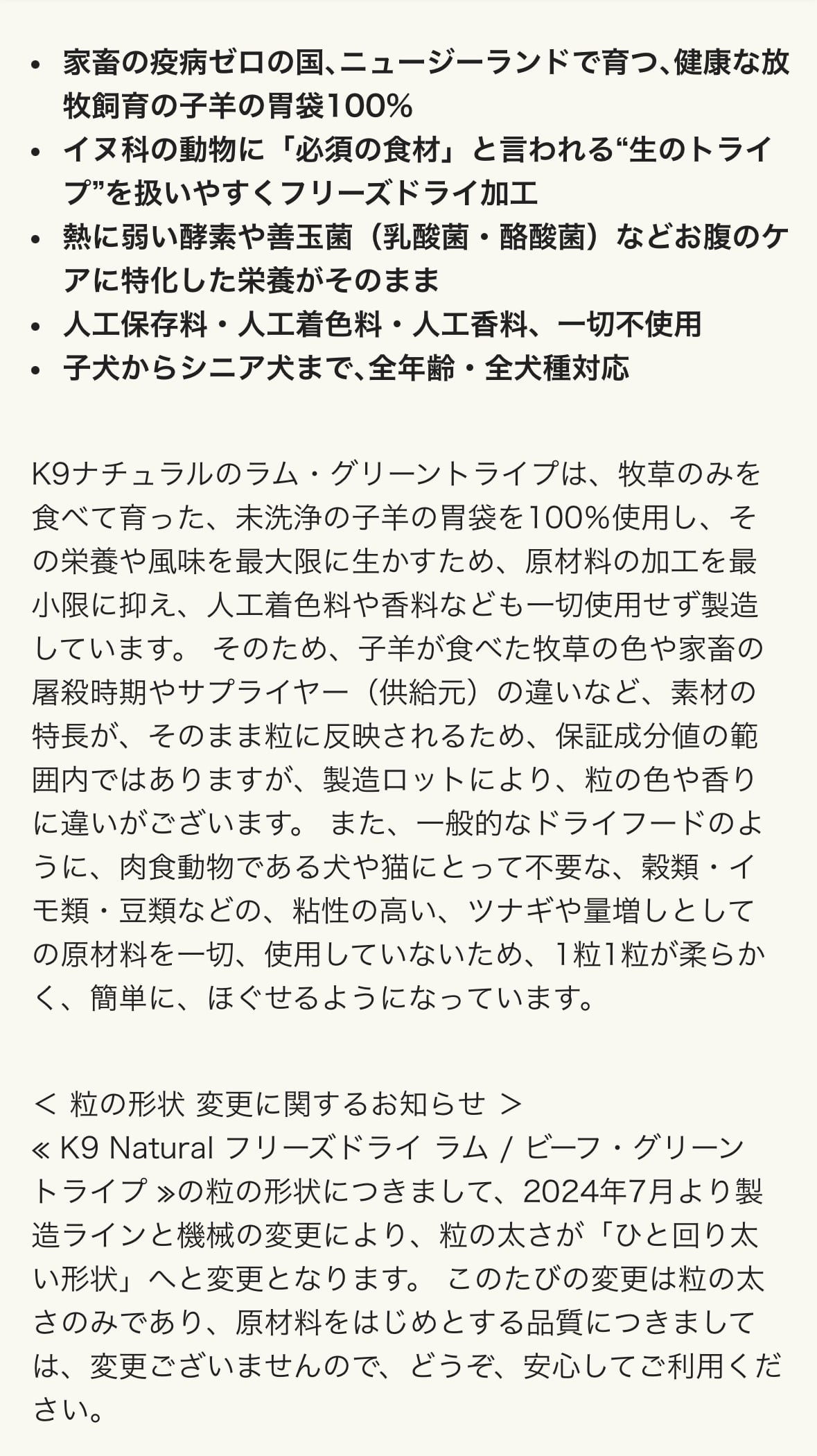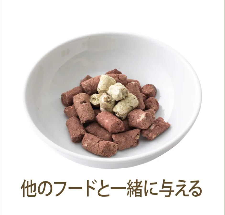 放牧飼育のラムの胃袋100%。フリーズドライだから、 熱に弱い“酵素”や“乳酸菌”も、香りも味もそのまま。 愛犬のための“美味しくてお腹にやさしい”自然のサプリメント。